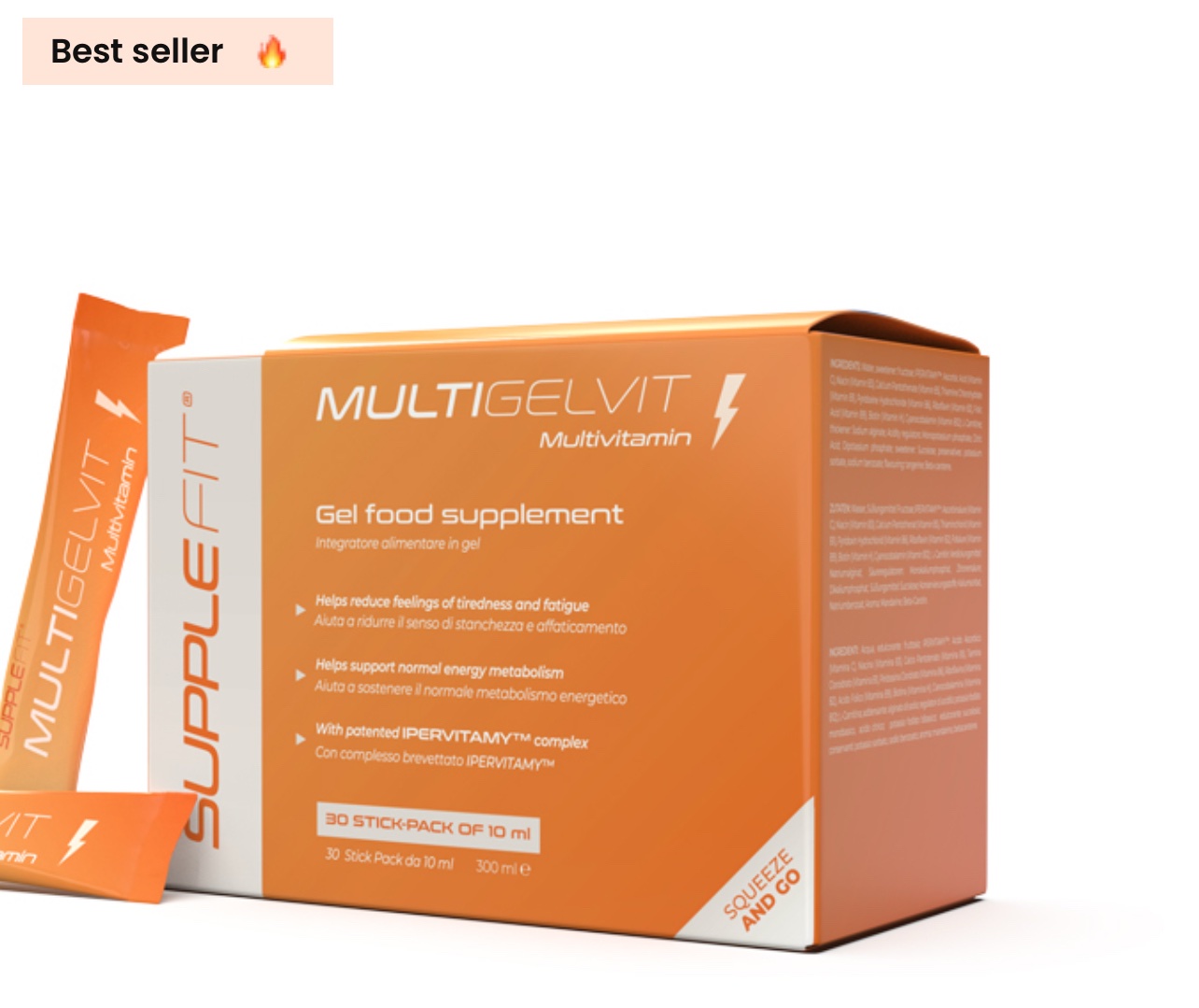 MULTIGELVIT est un complément alimentaire prêt à l’emploi à base de vitamines, aromatisé à la mandarine et sous forme de gel. La formule brevetée IPERVITAMY™ contient des niveaux équilibrés de vitamines B telles que B1, B2, B6, B12, B3 (Niacine) ; de la vitamine H (Biotine) et une quantité optimale d’acide folique et de vitamine C. Ce mélange de vitamines aide à réduire la fatigue et l’épuisement ; aide à soutenir le fonctionnement normal du système immunitaire, en favorisant les défenses naturelles ; et contribue à un métabolisme énergétique et à un fonctionnement psychologique normaux. De plus, la vitamine B5 (acide pantothénique) peut maintenir un esprit sain, soutenir les performances mentales et aider l’esprit à faire face aux tâches quotidiennes.